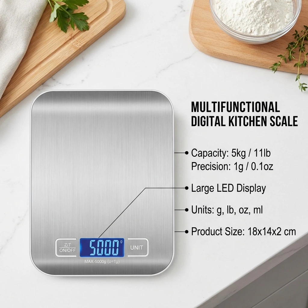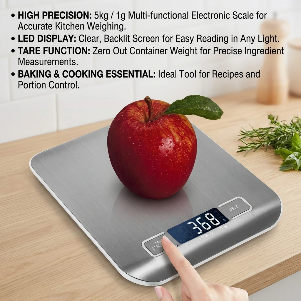 Accurately measure ingredients with this digital kitchen scale. Features a clear LED display for easy reading of weight measurements. Supports up to 5kg with 1g precision, ideal for food, baking, and small items like jewelry. The stainless steel platform is durable, hygienic, and easy to clean. Compact design fits neatly on any countertop or in drawers. Lightweight and portable for convenient use anywhere in the kitchen. Simple one-touch operation allows fast and accurate weighing. Perfect for cooking, baking, and portion control. Automatic tare function makes multi-ingredient weighing easy. This electronic kitchen scale is a precise and reliable tool for home and professional use.
